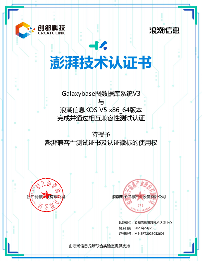 近日,浙江创邻科技有限公司(简称:创邻科技)自主研发的Galaxybase图数据库系统与浪潮信息服务器操作系统KOS V5完成澎湃技术认证。创邻科技作为国内首个成熟的商业图数据库供应商,在同类厂商中率先完成认证。测试结果显示,创邻科技Galaxybase图数据库系统V3与浪潮信息KOS V5 x86_64版本完全兼容,能够达到系统运行可靠稳定、性能表现优异要求,满足用户对关键性功能的需求。