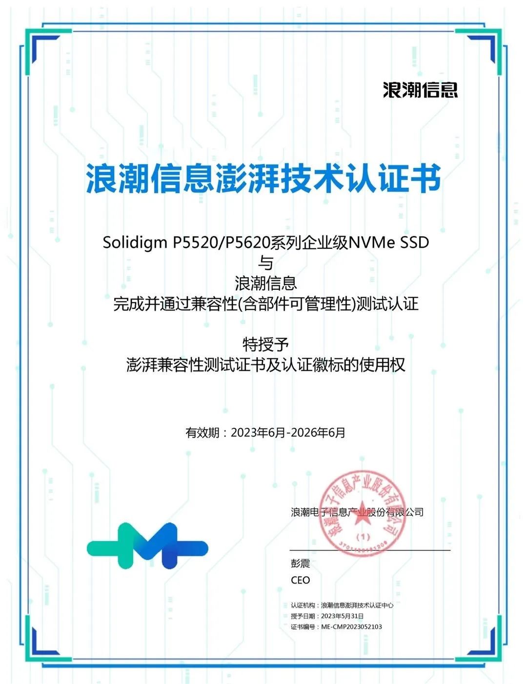 近日,Solidigm™ D7-P5520和D7-P5620系列企业级NVMe SSD完成与浪潮信息NF5280M6服务器平台的兼容性适配认证,最大化发挥双方产品的优势,性能、兼容性和稳定性等各项指标表现优异,获得浪潮信息澎湃技术认证授权证书。