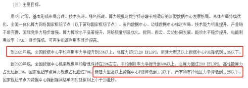 工信部近期印发《新型数据中心发展三年行动计划(2021-2023年)》,对PUE(数据中心总能耗/IT设备能耗)明确规定:到2021年底,新建大型及以上数据中心PUE降低到1.35以下,到2023年更要低于1.3。