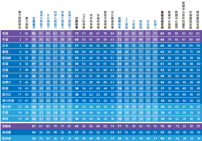 世界各国对算力的争夺从未停歇。在本次报告中,中美两国依然保持领跑者位置。2022年美国算力指数从77 分增长到82分;中国算力指数从70分增长到71分。