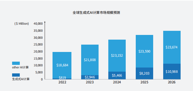 对于算力供需鸿沟问题,李东红的看法是,“未来算力发展一定要注重规模化发展。”在数字经济时代,各行各业需要更多算力,因此算力产业的规模必须起来。IDC预测,生成式AI计算市场规模将从2022年的8.2亿美元增长到2026年的109.9亿美元,占整体AI计算市场的比例将从4.2%增长到31.7%。