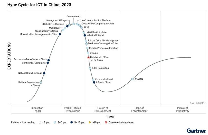 Gartner每年都会发布一份技术成熟度曲线报告,评选出业界最受关注的ICT技术。2023年ICT技术成熟度曲线涵盖生成式AI、AIOps、边缘计算、5G、混合云、云原生等20余项当下最热的ICT技术。