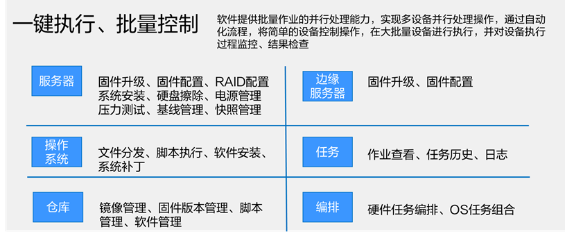 针对基础设施自动化过程中存在运维工具离散化,与业务场景切合度不高以及升级、配置、部署等流程复杂低效的难题,InManage在自动化运维管理方面,秉承“软件定义基础设施”产品理念,为用户提供可定义、自编排的服务器自动化能力,覆盖从固件升级到业务上线再到设备下架的全生命周期自动化运维场景。在某客户数据中心近4000台服务器上架工作中,通过浪潮信息InManage平台,帮助用户将部署周期从原来预计的几十天缩短至7天,运维效率提升450%以上,保障数据中心运维效率。
