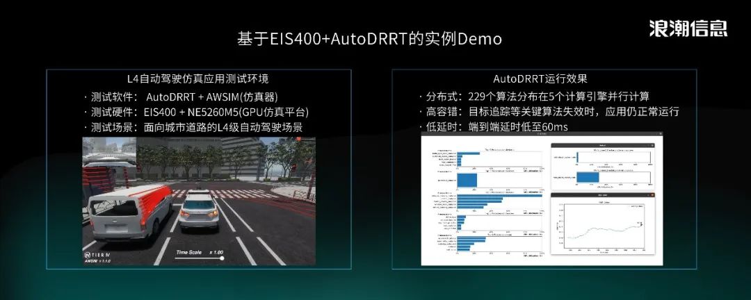 低延时计算功能:面对自动驾驶应用运行的低延时挑战,浪潮信息采用软硬件协同优化技术,从硬件系统层、软件环境层、应用框架层及算法内核层四个方面入手,采用40余种优化手段,综合考虑了计算、数据IO、通信的性能需求及耗时热点,最大化减少整体延时,基于AutoDRRT实现自动驾驶应用从感知到控制的端到端延时低至60ms,比行业内应用运行的平均时延降低40%,可以更好的满足自动驾驶对实时性的要求。