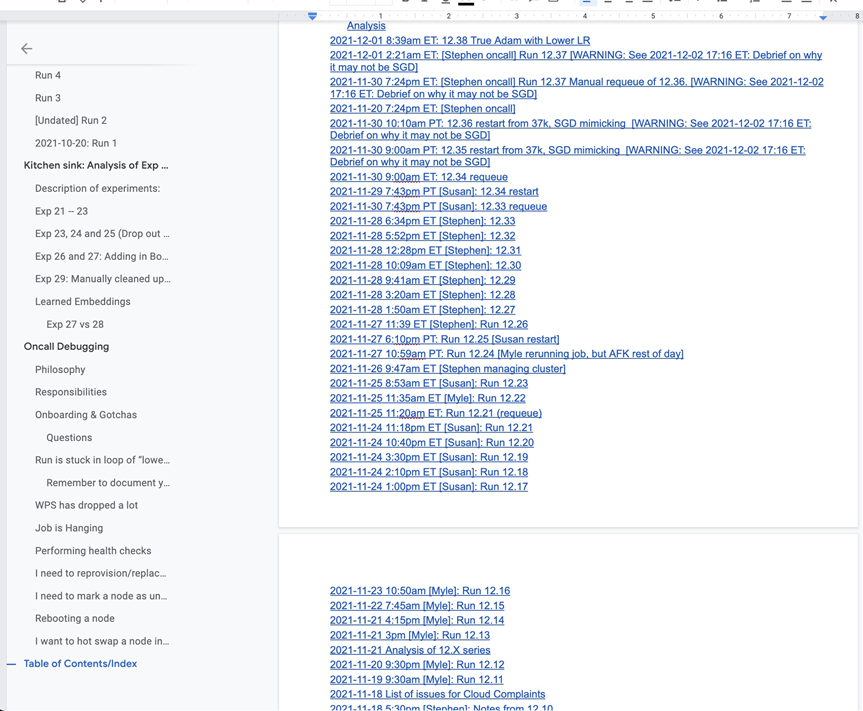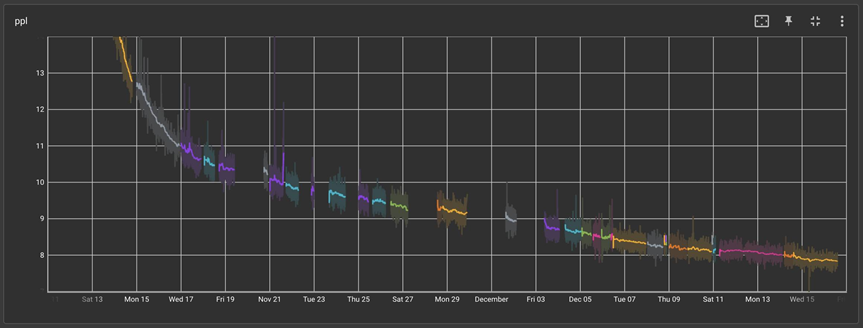 总而言之,解决基础设施问题占据了团队最后两周的大部分时间,因为这些硬件问题可能会在一天中的任何时间导致训练中断几个小时。虽然我们充分意识到这些问题会在这种规模的训练过程中反复出现,但考虑到在2021年底之前完成一个175B模型训练全部工作时间非常紧迫,我们别无选择,只能通过不停重启的方式,看看如果没有额外的训练工具的帮助我们能走多远。在找到一个加速重启的方案并安排了更多的人手24小时轮值维护之后,Meta依然还是要面对硬件层面的各种问题。内部训练进度的图表显示,接下来的两周之内,最长的3次连续训练时间长度只有2.8天,2天,1.5天。