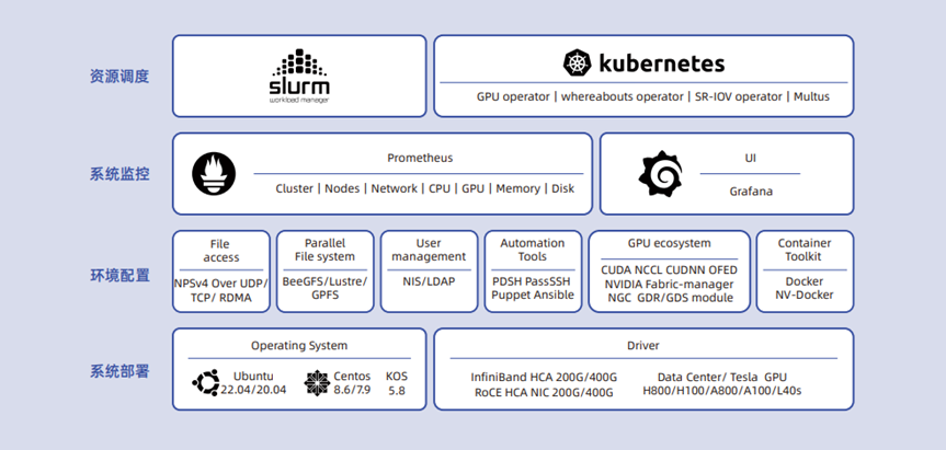 可以全面覆盖智算集群的部署场景,包括系统环境,从OS、驱动到系统监控可视化、资源调度等。值得一提的是,这是浪潮信息首创的一个开源项目。