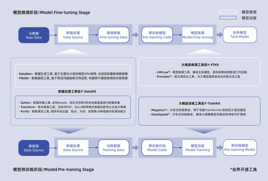 针对大模型开发的2个核心环节——数据处理和模型训练。浪潮信息在YLink中集成了大模型研发中所需的自研工具和开源工具,如数据处理工具包(Y-DataKit)、大模型训练工具包(Y-TrainKit)和大模型微调工具包(Y-FTKit)。这些多样且完善的工程化、自动化工具,大大加速了大模型的训练和开发效率。