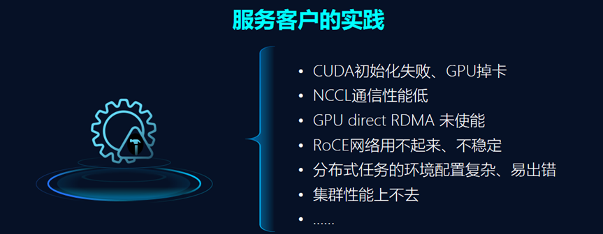 在集群架构及软硬件层面,解决了诸多如CUDA初始化失败、GPU掉卡、 p2p Bandwidth Latency延迟过高、NCCL通信性能低,GPU direct RDMA未使能等问题。