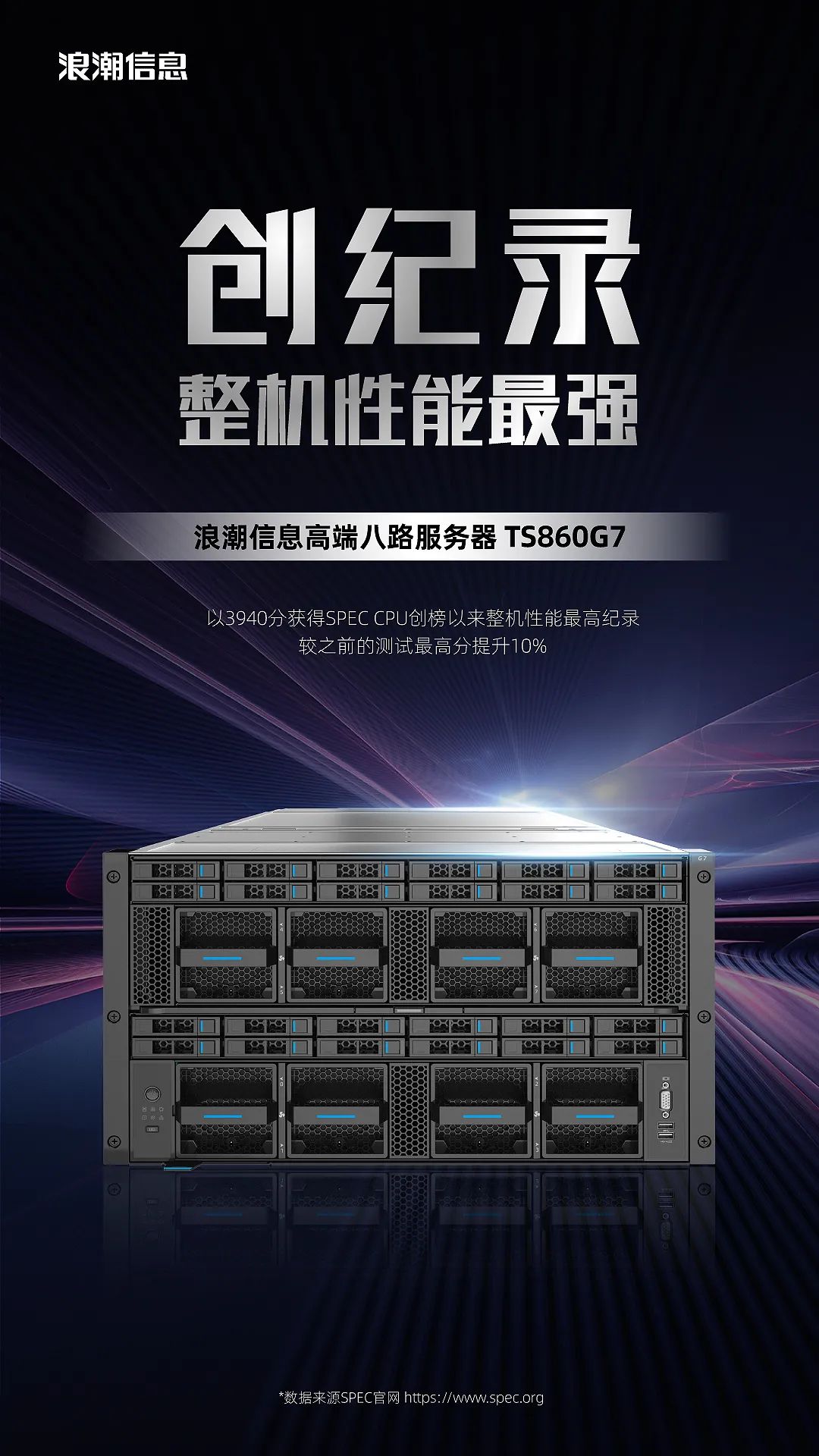 近日,国际标准性能评估组织SPEC发布新一轮SPEC CPU2017通用算力性能测试榜单,浪潮信息八路服务器TS860G7以3940分获得SPEC CPU创榜以来整机性能最佳成绩,打破了单系统服务器性能世界纪录,较之前的测试最高分提升10%。