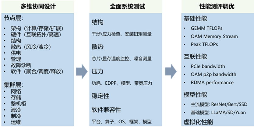 由于架构复杂度高、芯片种类多、高速信号多、系统功耗大等特点,异构加速计算节点常面临故障率高的问题。因此,《指南》提供了详细的系统测试指导,对结构、散热、压力、稳定性、软件兼容性等方面的测试要点进行了全面梳理,帮助用户最大程度降低系统生产、部署、运行过程中的故障风险,提高系统稳定性,减少断点对训练持续性的影响。