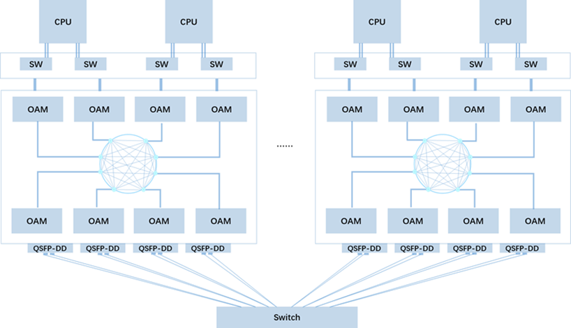 2019年,开放计算组织OCP面向大模型训练发布了开放加速计算(OAI)技术标准,旨在促进上下游协同,降低产业创新成本和周期。开放加速计算(OAI)系统架构具备更高的散热和互联能力,可以承载具有更高算力的芯片,同时具备非常强的跨节点扩展能力。因为天然适用于大规模深度学习神经网络,已经在全球范围内得到芯片、系统及应用厂商的广泛参与支持。