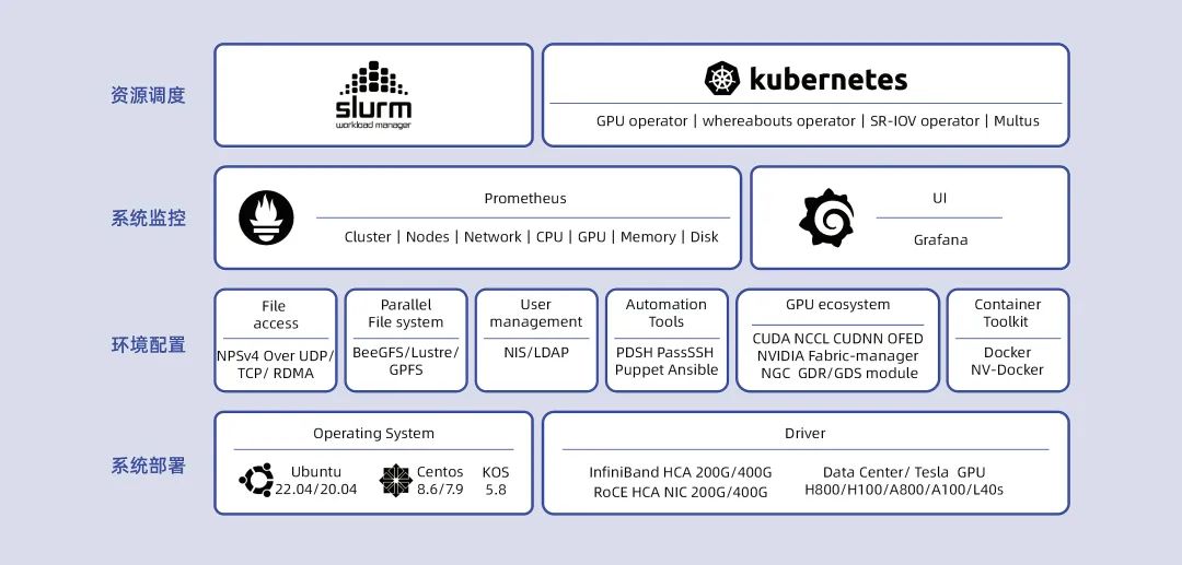 PODsys系统集成了大模型算力平台部署所需的操作系统、GPU驱动、网卡驱动、通信加速库等数十个驱动程序、软件和安装包,并提供了一系列脚本工具来简化部署,让用户可以快速安装、配置和更新集群环境。PODsys大量选用了业界广泛使用的主流开源系统、工具、框架和软件,来保障整个部署方案的开放性、兼容性和稳定性。