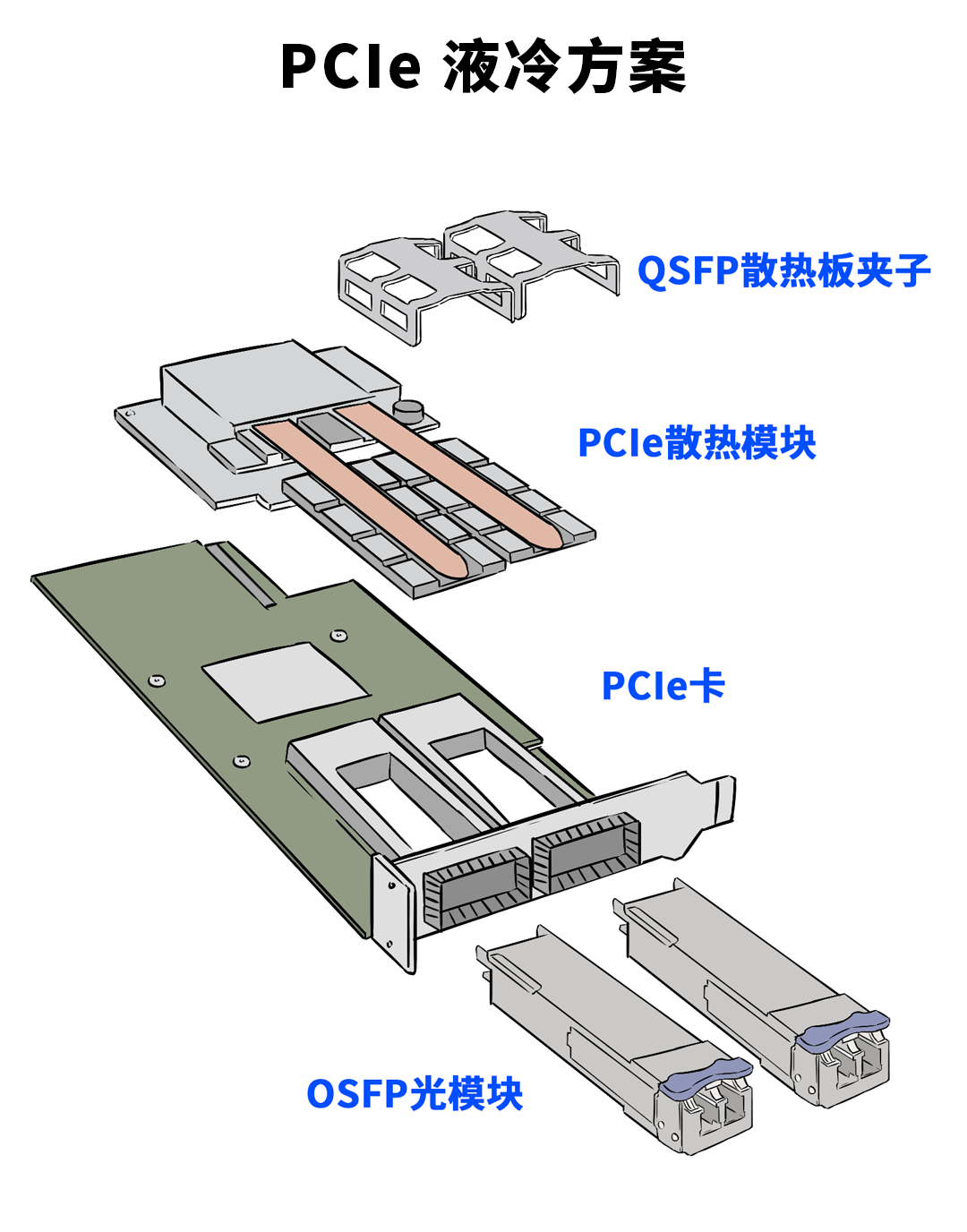 再比如PCIe卡或者OCP卡,需要热插拔维护,以PCIe卡为例,浪潮信息开发了与系统冷板接触的PCIe卡散热模块,来实现对光模块及PCIe卡上主要芯片的散热。