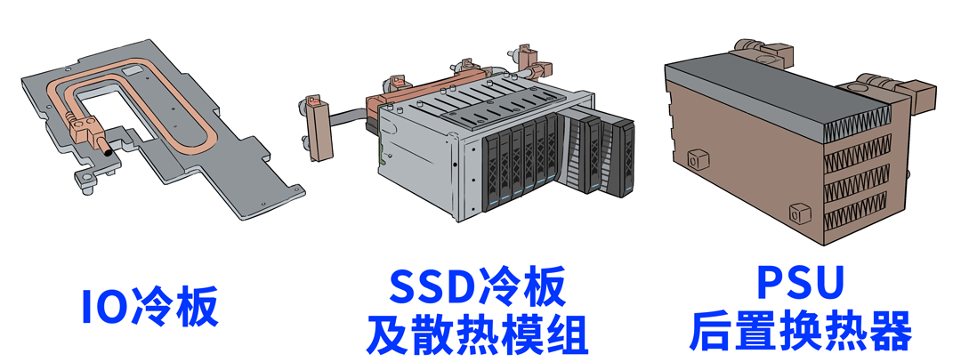 还有用于机箱IO区域的IO冷板、用于前端磁盘区域的SSD冷板、用于电源PSU的风液换热器等等。