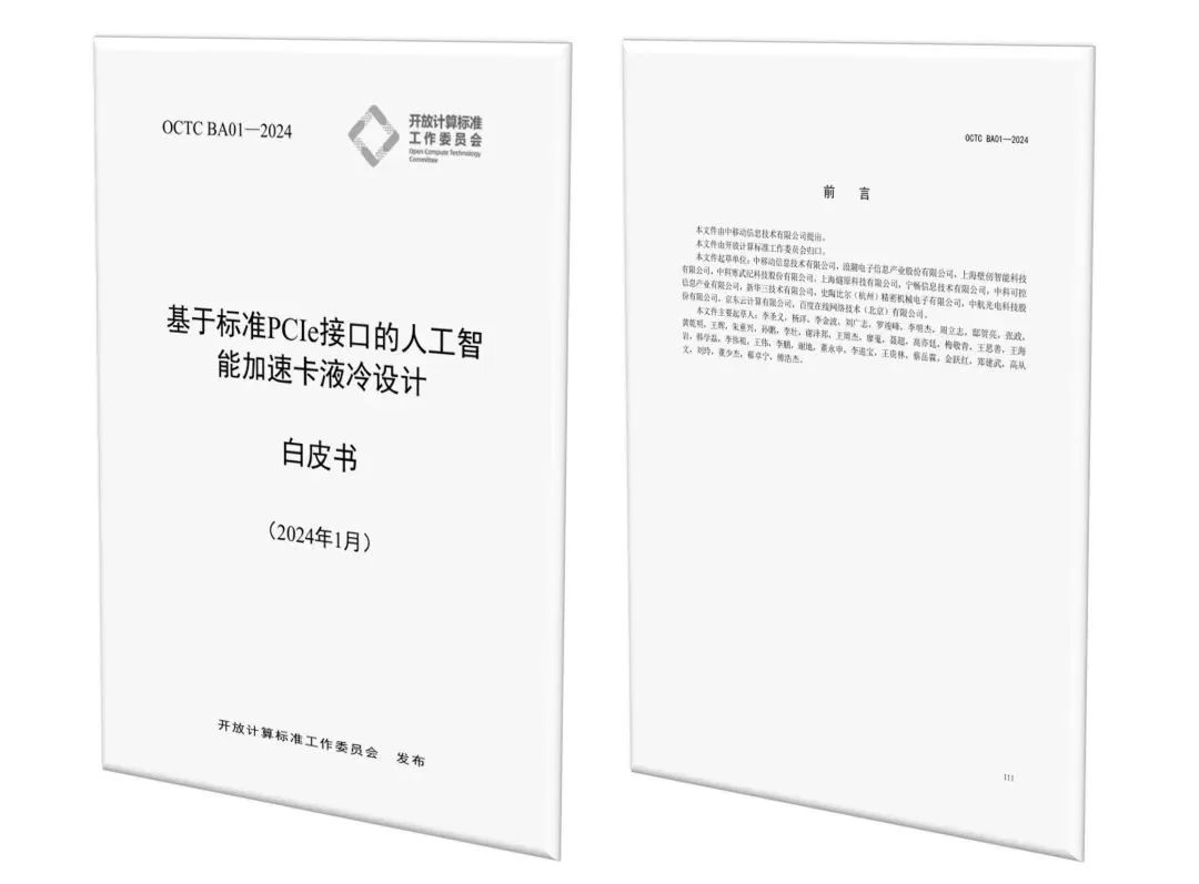 在近年飞速发展的AI计算领域,OCTC通过了基于标准PCIe接口的人工智能加速卡液冷设计、人工智能加速卡管理接口技术规范等项目立项。目前,《基于标准PCIe接口的人工智能加速卡液冷设计》白皮书已正式发布,通过定义统一的液冷加速卡接口形态,降低服务器适配难度,降低适配的成本和人力投入,同时降低部署和运维难度,并通过统一的设计指导产生规模化效益。