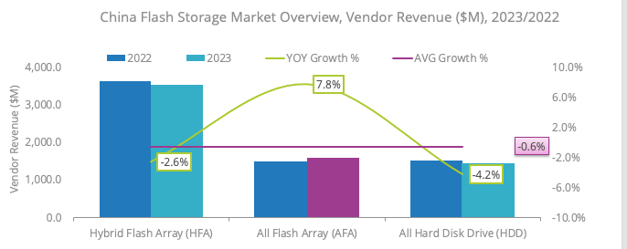 市场虽然下滑,但各个细分产品表现却迥异。数据显示,2023年全闪存阵列取得了7.8%的同比增长,市场占比提升到24.4%;混闪阵列同比下降2.6%,市场占比达到53.6%;全硬盘阵列同比下降4.2%,市场占比下降至21.9%。