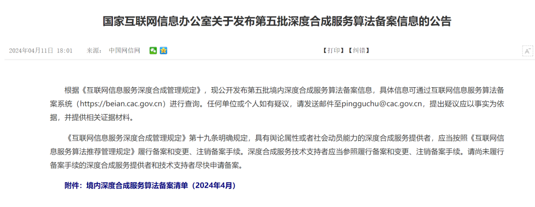 4月11日,国家互联网信息办公室公开发布第五批深度合成服务算法备案信息,浪潮信息开发的“源”大模型算法已完成备案并获公布。