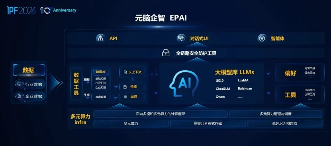 4月17日,在2024浪潮信息生态伙伴大会(IPF2024)上,浪潮信息重磅发布企业大模型开发平台“元脑企智”EPAI(Enterprise Platform of AI),为企业AI大模型落地应用提供高效、易用、安全的端到端开发平台,提供数据准备、模型训练、知识检索、应用框架等系列工具,支持调度多元算力和多模算法,帮助企业高效开发部署生成式AI应用、打造智能生产力。