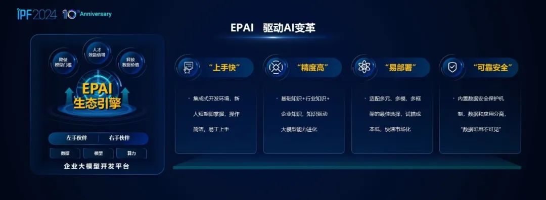 最新发布的企业大模型开发平台EPAI,将成为浪潮信息驱动伙伴AI变革的工具赋能平台。为此,浪潮信息推出“EPAI种子计划”,旨在打造AI业务变革的生态引擎,为伙伴开展多元多模创新、业务场景开发、商业价值变现等系列动作,提供开放的、统一的技术平台和业务平台,从而有效降低大模型门槛,帮助伙伴提升模型开发效能,实现智能业务转型。该计划首批遴选20家生态伙伴,并计划在3年内将数量扩充至1000家。