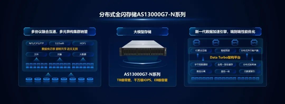 AS13000G7-N系列具备强大的端到端性能优化能力,这也是模型训练阶段最为核心的考量因素。浪潮信息基于计算和存储协同的理念,依托自研分布式文件系统构建了新一代数据加速引擎DataTurbo,在缓存优化、空间均衡、缩短GPU与存储读取路径等方面进行了全面升级。”