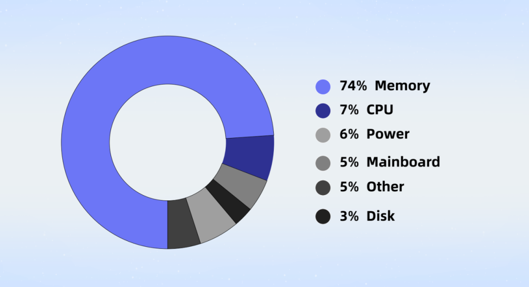 同时,随着内存工艺制程技术的提升,虽然内存工作电压不断降低、单位存储Cell的电荷量减少、内存工作频率急剧上升,但同时带来了电荷不稳定以及信号抗干扰能力降低的问题,使得内存UCE宕机故障频发,而业界对于UCE不可纠正故障的预测率较低,在55%左右。安全研究机构波洛蒙研究所进行了一些数据统计,统计结果为:具有一定规模的企业发生服务器宕机事件会带来平均每分钟近9000美元的损失成本,小型企业的损失在每分钟137至427美元。