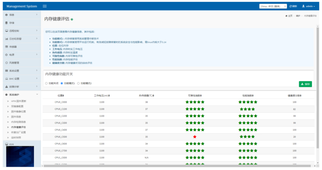 鉴于任何防护措施都不能完全确保内存器件的持久稳定运行,MUPR®系统构建了一套完善的服务器内存健康监控和风险预警机制。该机制依据内存错误数量、频率、类型、修复状态、错误风暴、温度变化等多方面信息进行内存可靠性评价、性能评价,以便客户在不同业务场景下选择性的对可靠性或性能异常的内存进行计划停机维护,有效规避非计划宕机带来的影响。此外,该技术可有效对内存健康情况进行评测,并根据内存健康度分数对内存异常进行预警,当内存分数低于异常阈值,提示用户及时更换健康硬件。