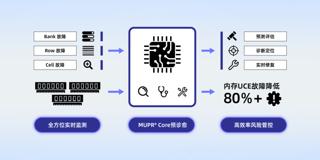 发现内存风险是第一步,而如何快速修复才是保障系统稳定的关键,MUPR®内存故障智能预警修复技术在操作系统、处理器、内存本体三个层级对风险单元进行全方位防护。