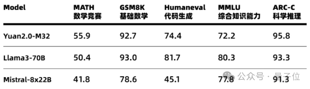 精度上,源2.0-M32在多个测评数据集上全面对标Llama3(70B,以下同),在MATH(数学竞赛)和ARC-C(科学推理)榜单还上超越了Llama3。