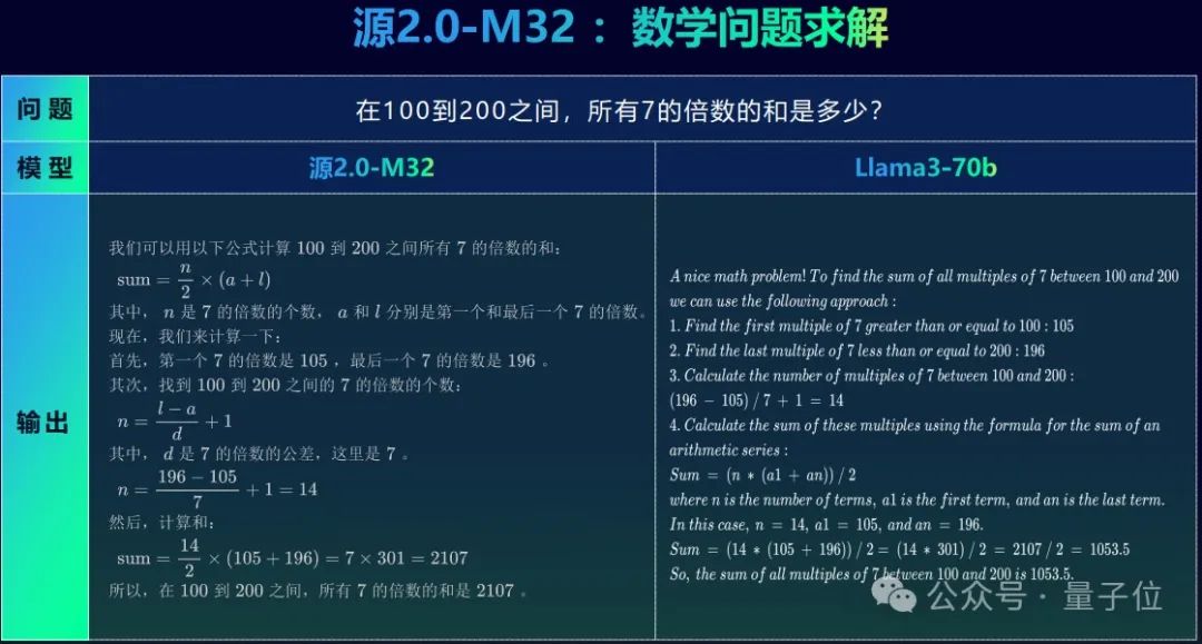 举个例子,在求解一道中文数学题目时,源2.0-M32能够用中文进行完整、准确作答,而Llama3虽然能理解中文题目,但回答时还是用了英文。