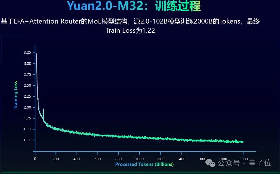 在训练阶段,使用2万亿token对源2.0-M32进行预训练,计算量只有同参数规模稠密模型的9.25%。