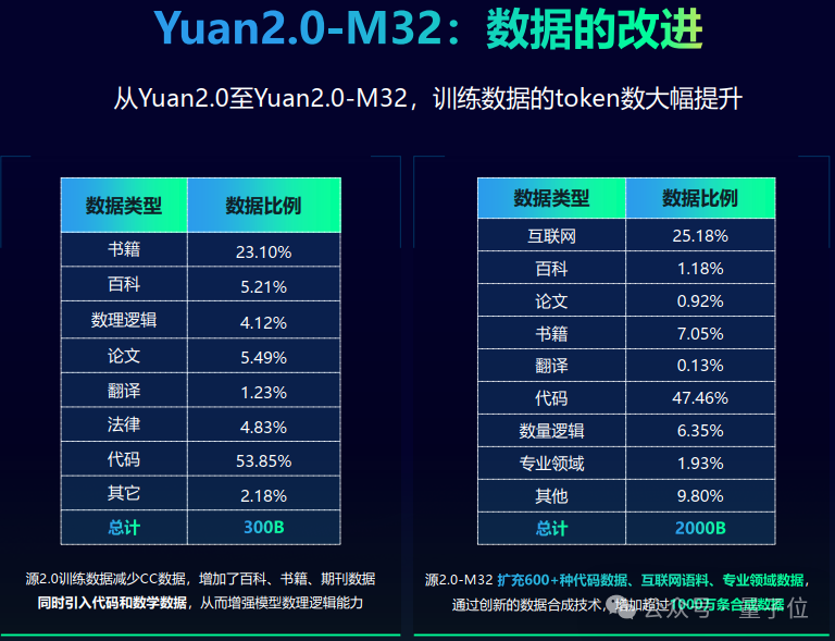 数据类型上看,源2.0-M32这个模型的2万亿token中,差不多有一半的数据都是代码,包含中文代码和英文代码。