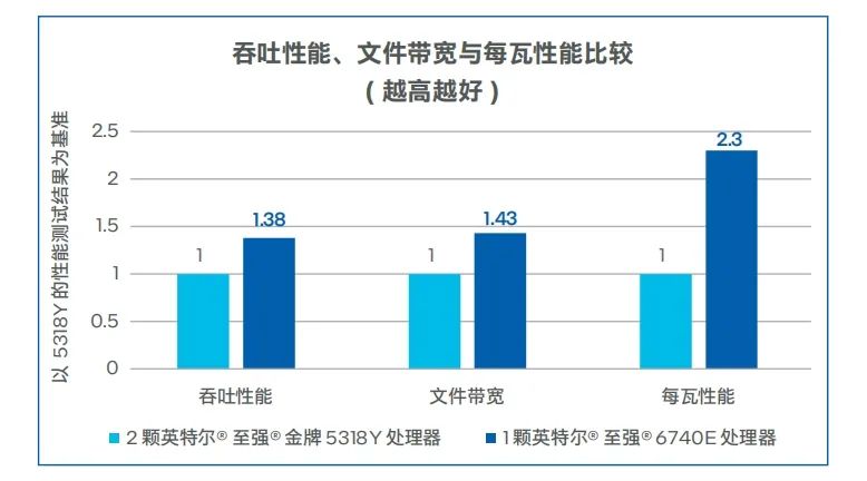 为验证基于英特尔®至强®6处理器的浪潮信息分布式存储AS13000在性能与能效上的表现,浪潮信息对其与第三代进行了比较。测试数据显示,搭载英特尔®至强®6处理器的AS13000,吞吐性能达到1.38倍,文件带宽提升1.43倍,每瓦性能提升2.3倍,同时每TB能耗降低22%。