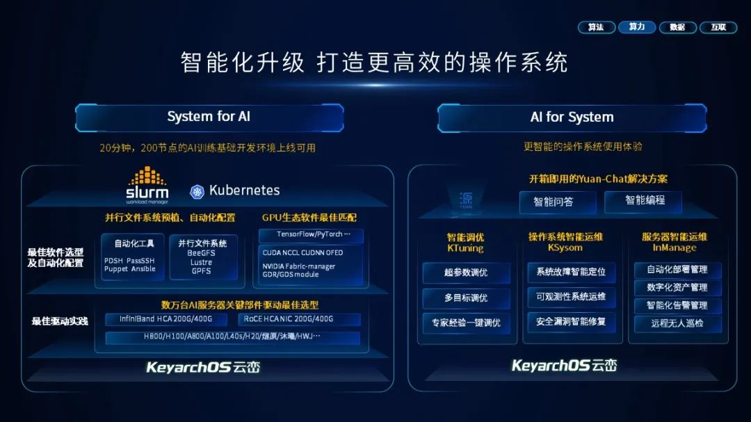 智能化升级方面,KOS新版本实现AI开发环境快速上线,包括为GPU、HCA卡等AI服务器关键部件驱动及CUDA/NCCL等GPU生态软件提供了最佳版本选型,预植lustre/BeeGFS等并行文件系统,并通过自动化工具快速配置AI开发环境,可在20分钟完成200节点的AI训练基础开发环境上线可用;AI for System方面,新版本融入开箱即用的Yuan-Chat解决方案,具备智能问答、智能编程能力,并且集成服务器智能运维、操作系统智能运维、智能调优组件,实现了系统故障智能定位、自动化部署管理、专家经验一键调优等更智能的操作系统使用体验。