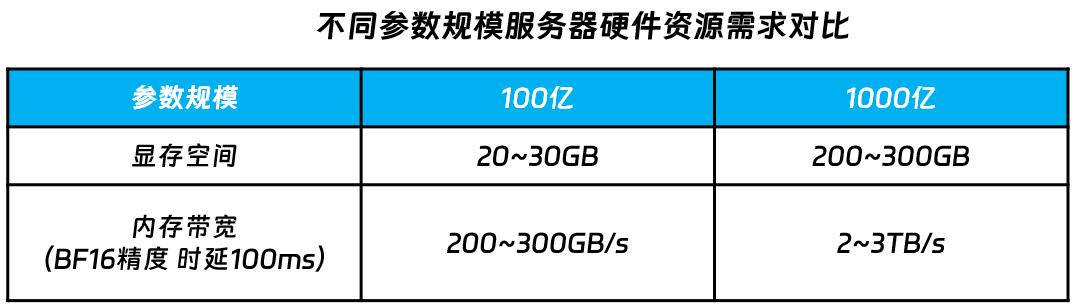 千亿参数大模型要在单台服务器中高效运行,对计算、内存、通信等硬件资源需求量非常大,如果使用以GPU为主的异构加速计算方式,千亿参数大约需要200~300GB的显存空间才放得下,这已经远超过当前业界主流的AI加速芯片的显存大小。放得下只是基础,千亿参数大模型在运行过程中,对数据计算、计算单元之间及计算单元与内存之间通信的带宽要求也非常高。千亿参数大模型按照BF16的精度计算,运行时延要小于100ms,内存与计算单元之间的通信带宽至少要在2TB/s以上。