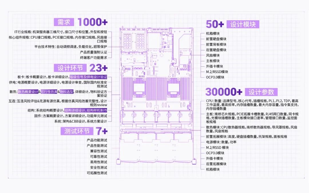 服务器是一个复杂程度超出想象的系统。一台服务器的元器件数量超过10000颗,50余种模块,线缆800余种,这些模块和器件共有参数30000多项。