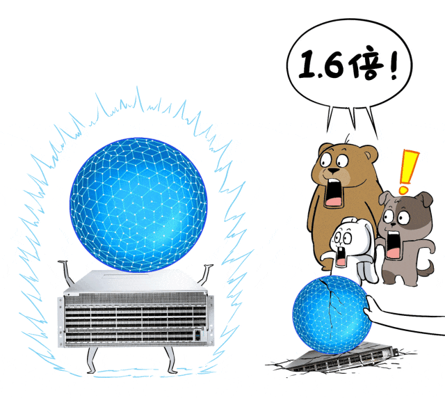跟同行们的51.2T方案相比,用这款交换机组网训练大模型,训练性能可以提升至1.6倍。