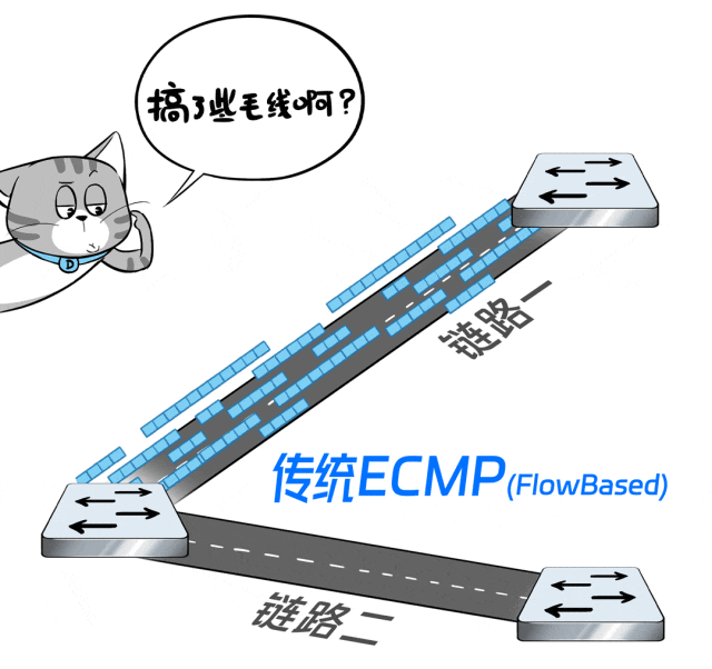 但是吧,ECMP的负载分担,是基于流的(Flow Based,根据每条流哈希值的不同,调度到不同的链路上),粒度太粗犷。