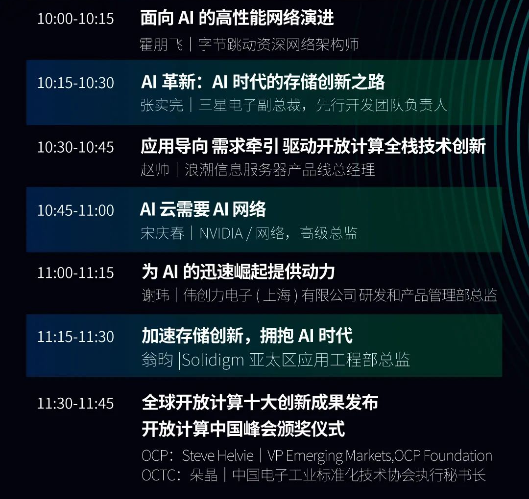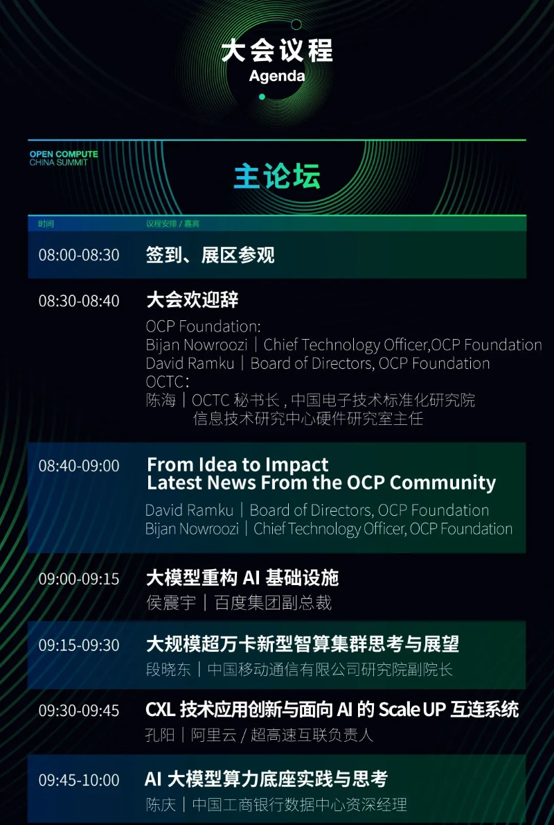 峰会现场,主办方代表OCP首席技术官Bijan Nowroozi、OCP基金会理事David Ramku,以及OCTC秘书长、中国电子技术标准化研究院信息技术研究中心硬件研究室主任陈海,将作开场致辞。