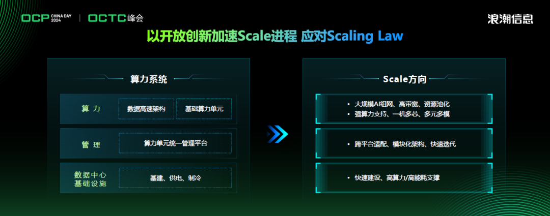 在基础设施方面,数据中心面临智能算力扩展的两大Scale挑战:一是GPU、CPU算力提升,单芯片单卡功耗急剧增加,单机柜在供电和制冷上面临着Scale up支撑挑战;同时,Scaling Law驱动GPU规模无限膨胀,达到万卡、十万卡级别,带来了数据中心层级Scale out的支撑挑战,需要开放标准和开放生态将实现基础实施的Scale,满足快速建设、高算力/高能耗支撑要求。采用开放标准、开放生态构建的数据中心基础设施,能更好地匹配智算时代多元、异构算力的扩展和迭代速度,进而支撑上层智能应用的进一步普及。以浪潮信息为例,基于开放标准推出的液冷冷板组件,支撑单机系统内GPU和CPU核心算力原件Scale up扩展;推出模块化、标准接口的120kw机柜,兼容液冷、风冷场景,支撑柜内更大的部署需求;推出基于开放标准的预制化集装箱数据中心,大幅压缩建设周期,其扩展性很好的满足了AI算力系统的Scale需要。