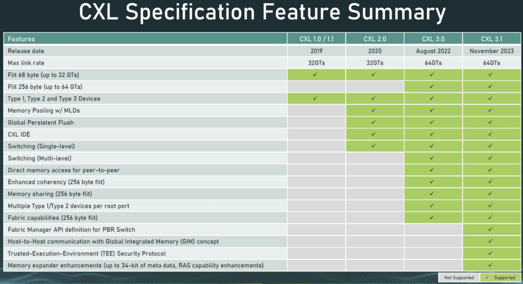 自2019年首次发布以来,CXL在过去几年里已经演进到了CXL 3.1标准。在适用范围方面,也从一开始的仅支持有限功能,增加到对横向扩展 CXL 进行了额外的结构改进、新的可信执行环境增强以及内存扩展器的改进。