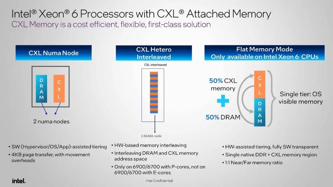 作为CPU产业龙头以及CXL的主要推动者之一,英特尔持续推进这项技术的进步和普及,公司是CXL spec的主要贡献者,同时也在Linux kernel里贡献了大量CXL相关的代码。第四代英特尔® 至强® 可扩展处理器支持CXL1.1,提供对Type1, Type2, Type 3设备(也就是大家期待已久的CXL内存扩展设备)的支持。在最新的至强6上,英特尔为CXL 2.0协议提供了支持,后续会有下一代新产品的持续支持和CXL技术迭代。