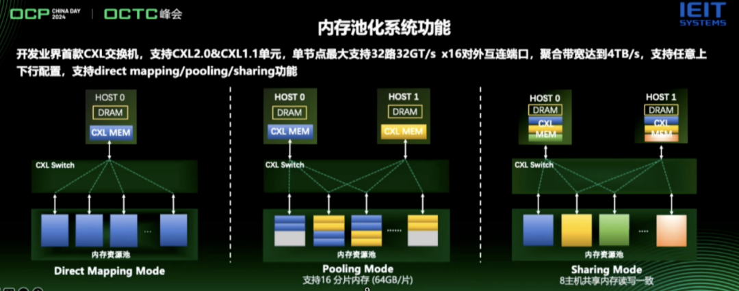 基于领先的技术积累,浪潮信息也开发出了领先的内存池化原型系统,实现多主机内存资源池化与共享,最大支持8HOST主机共享访问内存资源池,支持百纳秒远端池化内存访问。当中,浪潮信息还开发出了业界首款CXL交换机。支持CXL2.0&CXL1.1单元,单节点最大支持32路32GT/s x16对外互连端口,聚合带宽达到4TB/S,支持任意上下行配置,支持direct mapping/pooling/sharing功能。