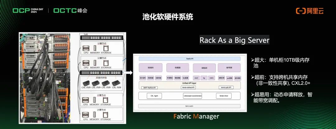 就拿阿里云推出的业界首个基于CXL Switch内存池的业务系统解决方案来说,该设计支持CXL扩展、池化、共享,通过CXL Farbic,对各类设备进行扩展。早在2022年云栖大会曾介绍该CXL方案的系统架构,并在2023年云栖大会展示了CXL Switch+ CXL Memory Box的硬件设备,是业界首家发布相关软硬件系统的云计算公司。该方案通过CXL Switch Box系统,提供大容量、高性能、灵活性强的池化内存系统,可搭载包括阿里自研持久化内存AliSCM、大容量CXL接口AliMemory等部件。