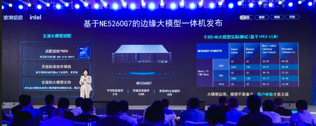 在产品全面升级的同时,浪潮信息重磅发布首款边缘大模型一体机,为客户开发和部署边缘AI应用,提供开箱即用、训推一体、软硬协同的全栈式边缘智算平台。此次发布的边缘大模型一体机基于元脑NE5260G7边缘服务器,具有多元多模、开放全栈、开箱即用、安全隐私等特点,支持适配多种异构加速芯片,支持多种主流及垂直领域大模型部署、融合了开放的标准软件堆栈,可提供低时延和高性能的边缘推理算力。