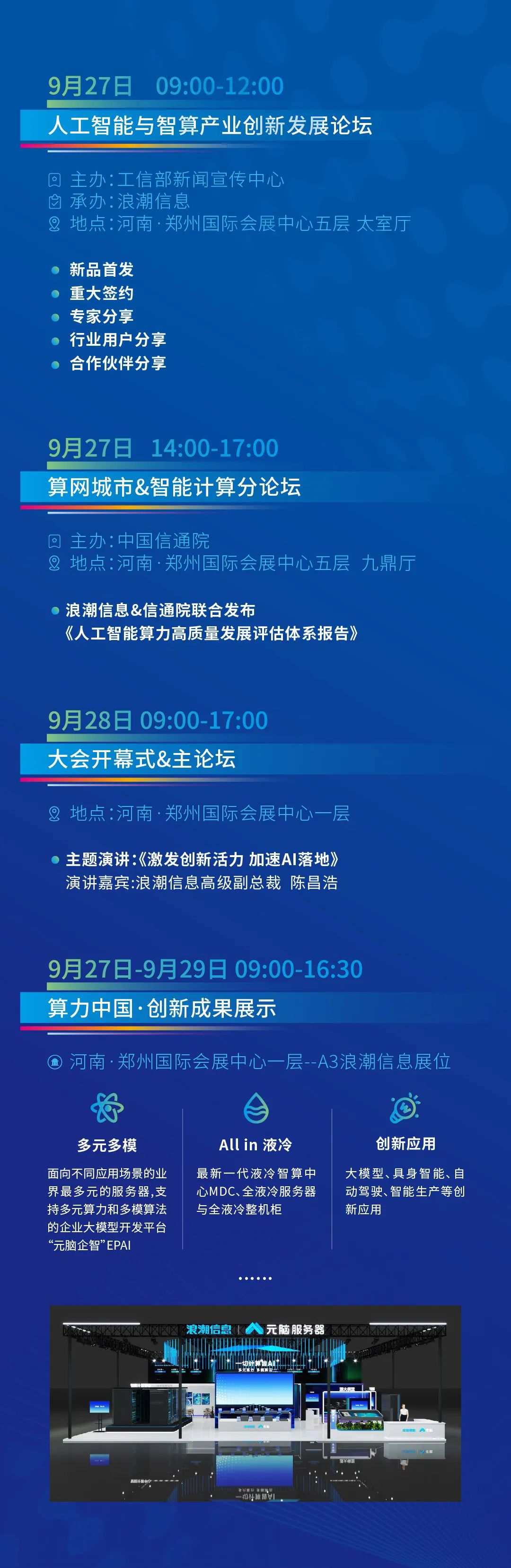 作为全球领先的算力基础设施供应商,浪潮信息连续第三年亮相算力大会。2024年中国算力大会,浪潮信息将聚焦多元算力、多模算法、企业大模型开发等热点议题,举办创新发展论坛、发布洞察报告、分享前沿技术成果、展示领先技术方案......