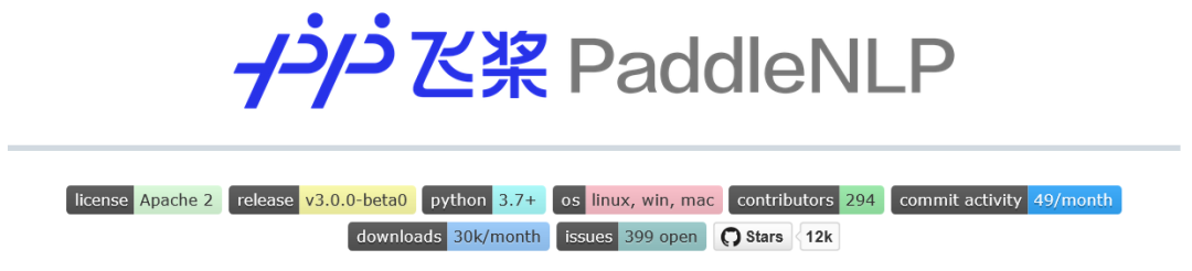 PaddleNLP是百度基于飞桨框架打造的大语言模型套件,聚合业界优质预训练模型并提供开箱即用的开发体验,覆盖NLP多场景的模型库,搭配产业实践范例,提供极致的训练与推理性能,可满足灵活定制的开发需求。