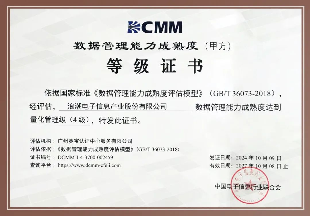 日前,浪潮信息正式通过中国电子信息行业联合会数据管理能力DCMM(Data Management Capability Maturity Model)等级认定,获得四级“量化管理级”认证。