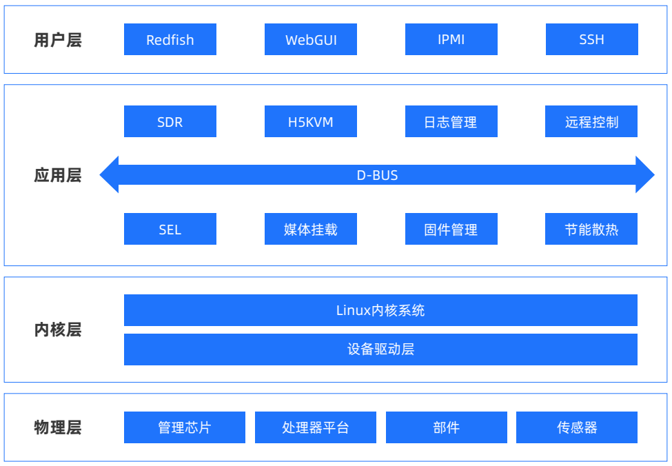 技术方面,OpenBMC历经近十年磨砺,深度整合Linux开源生态,利用Yocto构建工具将前沿的Linux内核、Systemd、D-Bus、GCC等技术编织成一套高度可扩展的软件架构。其中D-Bus系统总线的引入,不仅优化了进程间通信,还通过归一化接口实现了应用层模块的解耦,构建了层次分明、易于扩展、稳定性强的软件框架,无缝兼容多种处理器平台与算力芯片,支持快速、灵活的模块化开发与适配,并提升了系统稳定性与可靠性。同时,相较于传统BMC使用的C语言,OpenBMC采用C++面向对象编程,极大地丰富了函数库资源,显著提升了开发效率与灵活性。