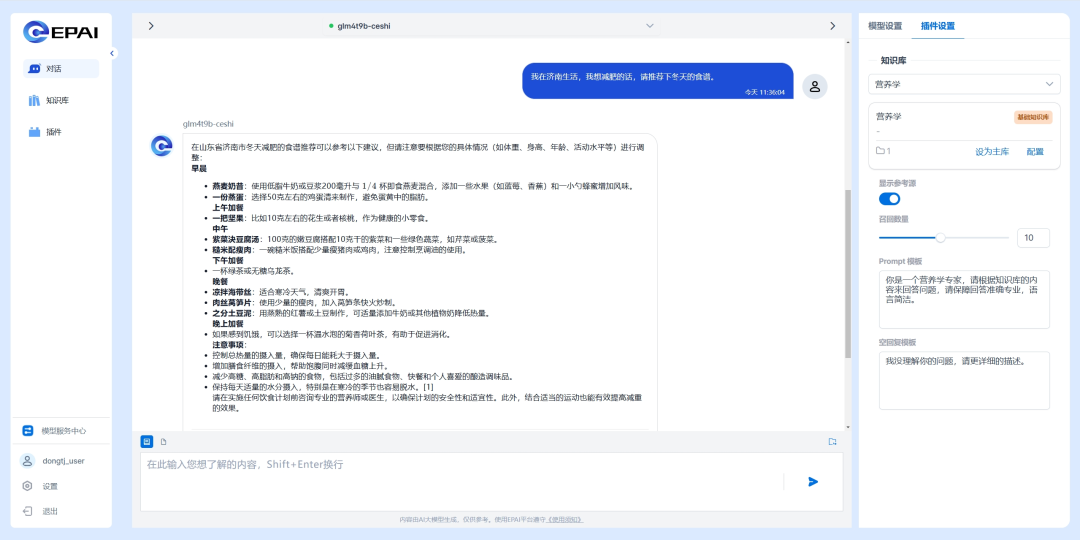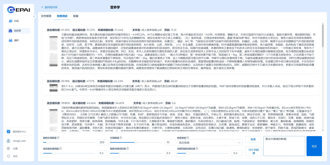 在线交互中,用户输入问题,元脑企智EPAI将结合知识库内容,通过大模型生成准确的回答,并展示引用源。下图展示,元脑企智EPAI作为营养问答助手,通过检索增强生成,提供营养方面的回答。