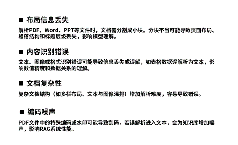文档解析是RAG系统预处理的第一步,解析准确性直接影响知识库内容的质量和效果。如果文档解析存在问题,知识库中将包含大量不准确的信息,将直接影响后续的检索和生成环节,导致整个RAG系统的性能下降。